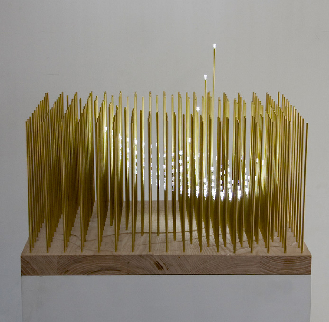 Een bootje van licht in een zee van messing buisjes; een nabeeld van het werk Miracle in Between dat eerder gerealiseerd werd in Delhi, India.