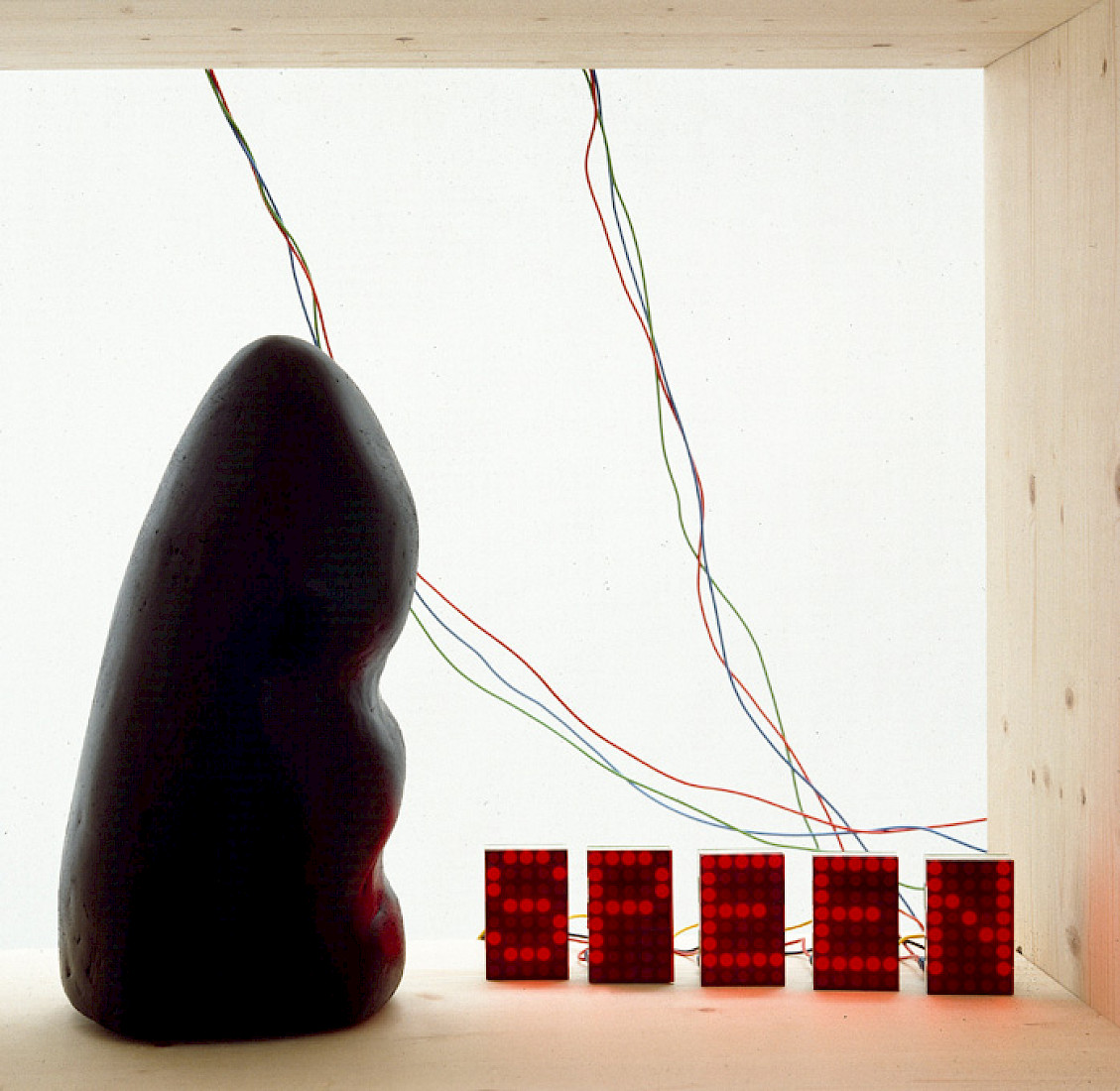 Op de blanke houten tafel, stoel en boekenkast staan amorfe vormen en rijtjes led-displays met letters die samen woorden vormen. Onophoudelijk maar in verschillend tempo veranderen deze woorden, door een letter te vervangen door een andere. De veranderingen zijn associatief tot stand gekomen en hebben een dichterlijke relatie met de Zwarte vormen. Op onvoorziene momenten wordt deze poëtische en experimentele staat verstoord door woorden zoals geld, tijd, liefde, die van rechts naar links over de led-displays lopen.